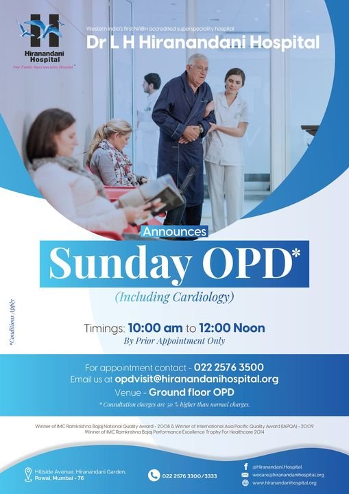 Dr L H Hiranandani Hospital announces Sunday OPD (including cardiology).